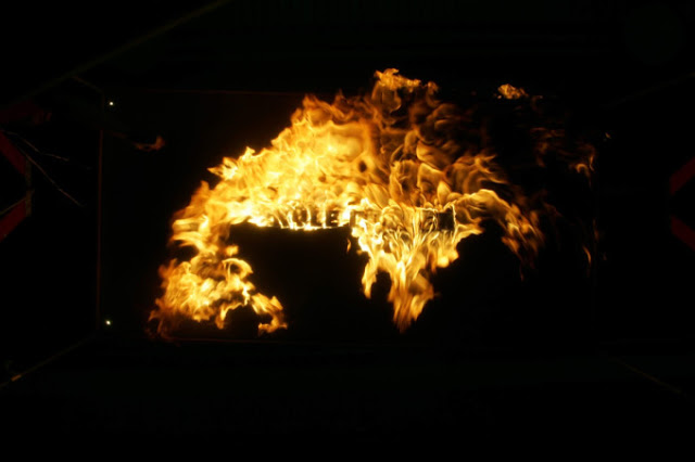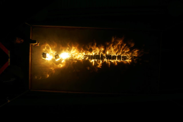 So I didn’t want to do something that was really computer-generated. I wanted to do something that was more hand-made. I wasn’t real sure what that was going to be, but I liked the idea of seeing the flaming pieces fly off the buildings when Godzilla smashes them. So I thought about just having burning type, and I didn’t want to make fire in CG because I wanted it to be accidental. I wanted to see what would happen when I burned real letters. So I created this elaborate rig where I have these 20-foot ladders, and I cut all the letters out of wood, and then I put nails on the back, and I had magnets. So by hand, we letter-spaced out every credit, and each credit was about four inches high, made out of wood, and then I soaked them down with gasoline, and I had a camera that was looking straight up and a piece of glass between myself and the type above me.
