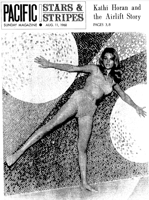 KH: Probably the one thing I am the most proud of while in Japan was the fact that I was Miss Airlifter from ‘67 to ‘69. The 315th Air Division had a monthly newspaper called The Airlifter. I had a monthly column [safety column] with a picture that appeared every month. There also was a three-page article that ran on me in the Pacific Stars and Stripes [August 11, 1968], “Kathi Horan and the Airlift Story.” Thus, those pictures of me on C-130s! I got tons of fan mail from guys in Vietnam, and I must say I answered them all. I also once every four months or so toured the hospitals at Tachi and visited with injured G.I.s.