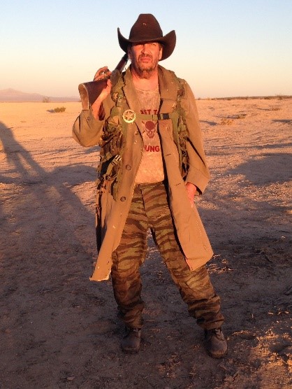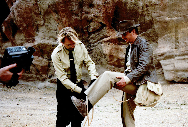 So my film partner Jason and I went to work. We took my brother’s Toyota truck, a motorcycle, and an Indy costume out to the desert. I couldn’t afford a real leather jacket, so I found a women’s dark vinyl jacket with huge lapels. After cutting them and folding them under, and dragging the coat around in the dirt, it became a passable Indy jacket on film.