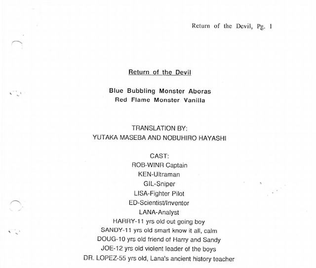 BR: The English-translated script I was provided had the title “Return of the Devil” and featured two monsters – “Blue Bubbling Monster Aboras” and “Red Flame Monster Vanilla.” I was really able to play with cross-cutting in the script, moving between each of the two monsters, as well as humans working to overcome their own perils. It was ideal for creating tension on paper, which results in tension onscreen if the editor follows my blueprint. As with the Gabora episode, I was also given monster illustrations so I’d know what the creatures, and the toy product tie-ins, looked like.
