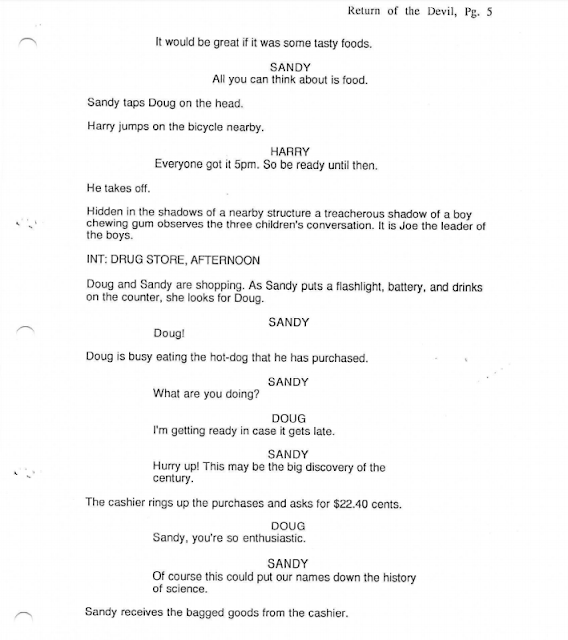 I tossed all that dialogue away and created new characters who could trigger the same essential actions. To motivate the characters, I came up with the school-reporter angle and made them high-school age. I reduced the number of kids from four to two – the bare minimum required for dialogue. Fewer characters meant more time devoted to each one, giving me a chance to flesh them out a little bit rather than leaving them as cardboard cutouts.