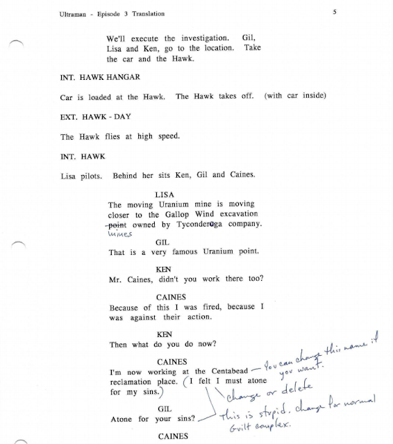 Having successfully delivered the Gabora script, I had a lot of freedom with the Pestar script. I was able to create tension with Mendez being grounded, then giving him redemption by jumping into the cockpit to help when the WINR team needed him. I invented an underwater rescue sequence between a sub and an aircraft. And I was able to retain the key Ultraman vs. monster battle required. With three competing story lines, the cross-cutting was fantastic on paper. I could see the show clearly as my fingers flew on the keyboard.