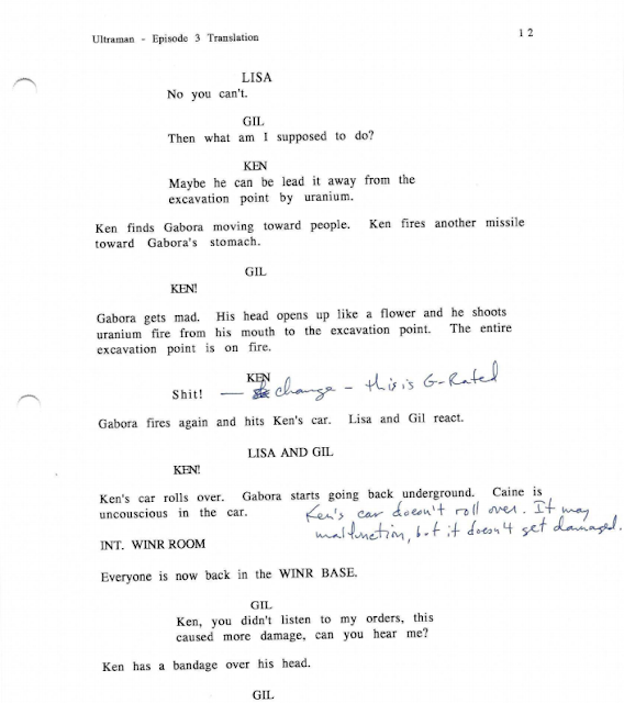 Since this was my first script for King and Julie’s Major Havoc Entertainment, I didn’t want to stray too far from the translated source script. As agreed, Kazunori Ito got story credit for the source material, and I got sole teleplay credit for adapting his work.