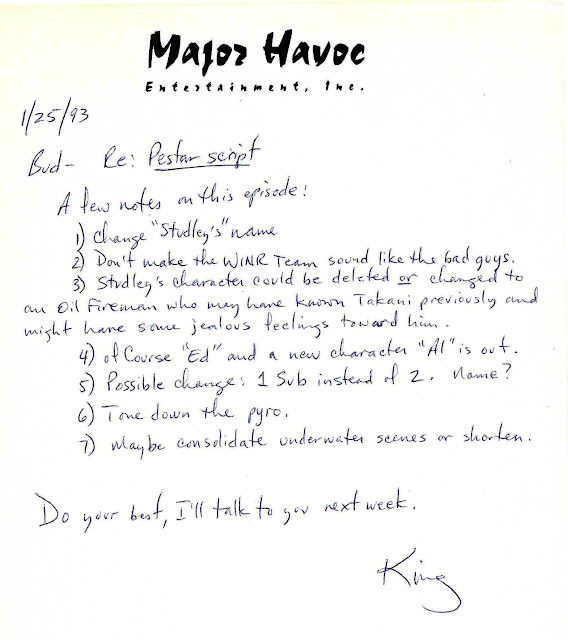 I wrote three drafts of the Pestar script. About a week and a half after I received my second assignment from King with high-level notes dated January 25, 1993, I delivered the first draft on February 7, 1993. King accepted my first draft script virtually as written, even though I had made significant changes to the translation source. My second draft with minor tweaks was delivered four days later, on February 11, 1993. Production notes were addressed in a final shooting script, which I delivered on April 4, 1993, the same day I delivered the final shooting script of the Gabora episode.